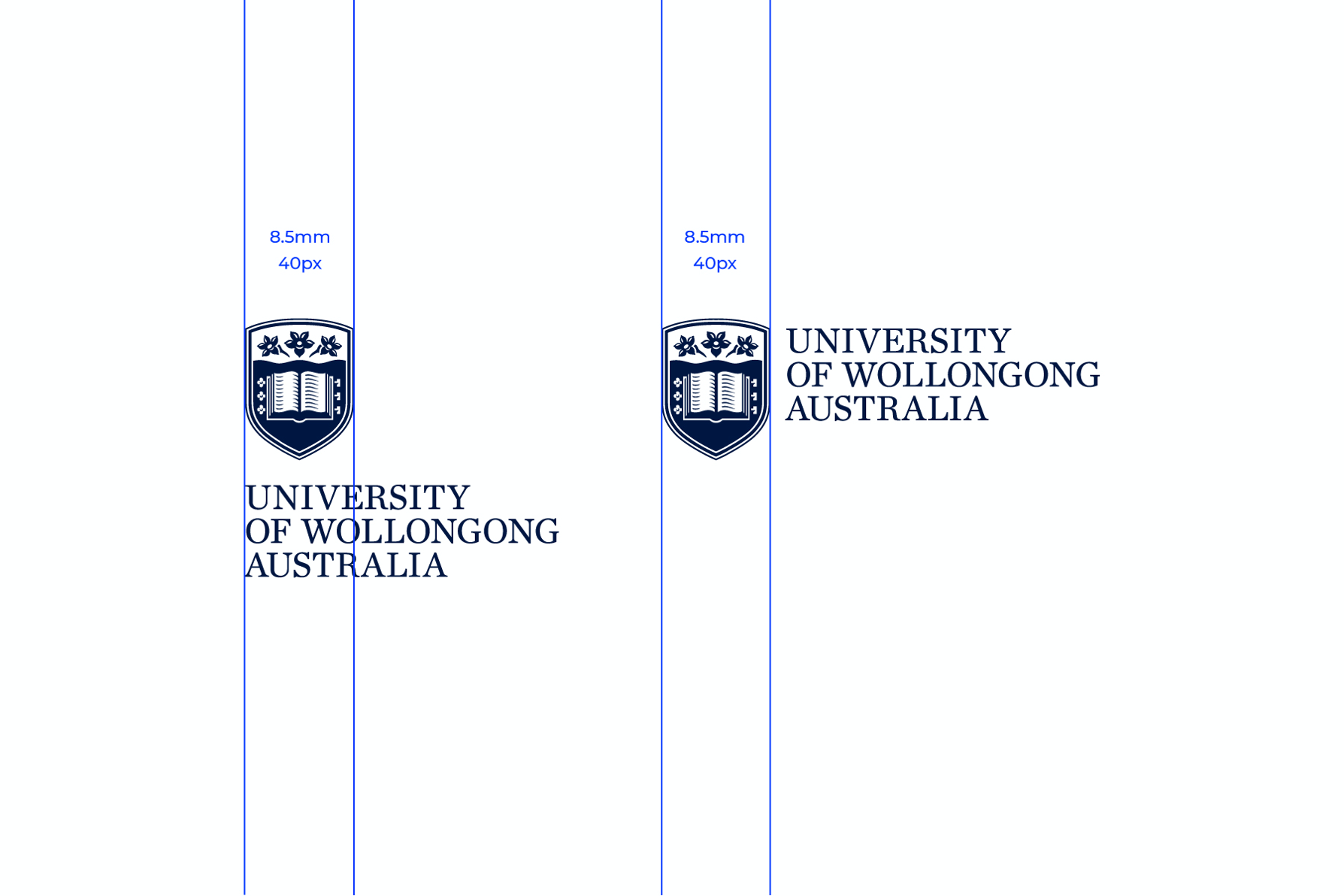 Minimum size is be defined by the width of the crest, no matter which version of the UOW logo you are using. For print, the minimum size is 8.5mm and for screen, it is 40px.