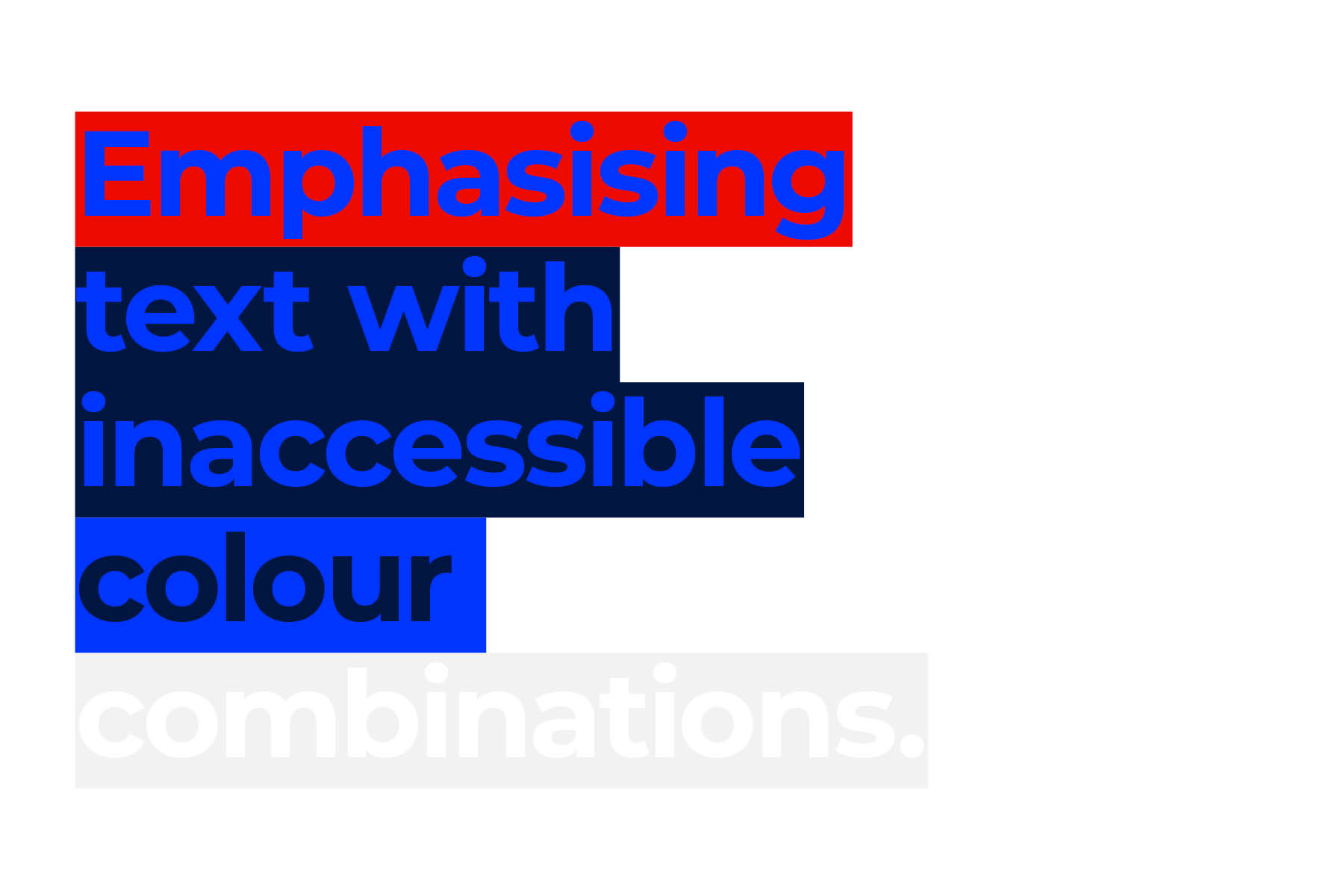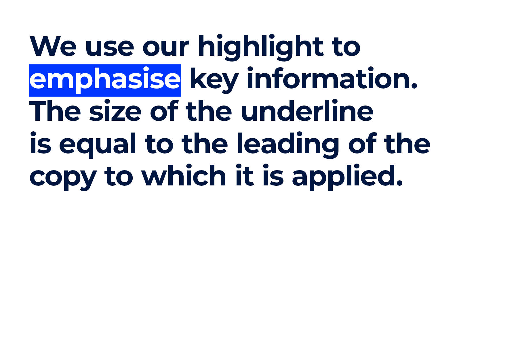 Another way to use highlight is when applying highlights to paragraphs that sit over imagery. Here, they provide legibility and stand-out to a message. As a general rule, use a White or Dark Blue underline and emphasise with either Red or Bright Blue.