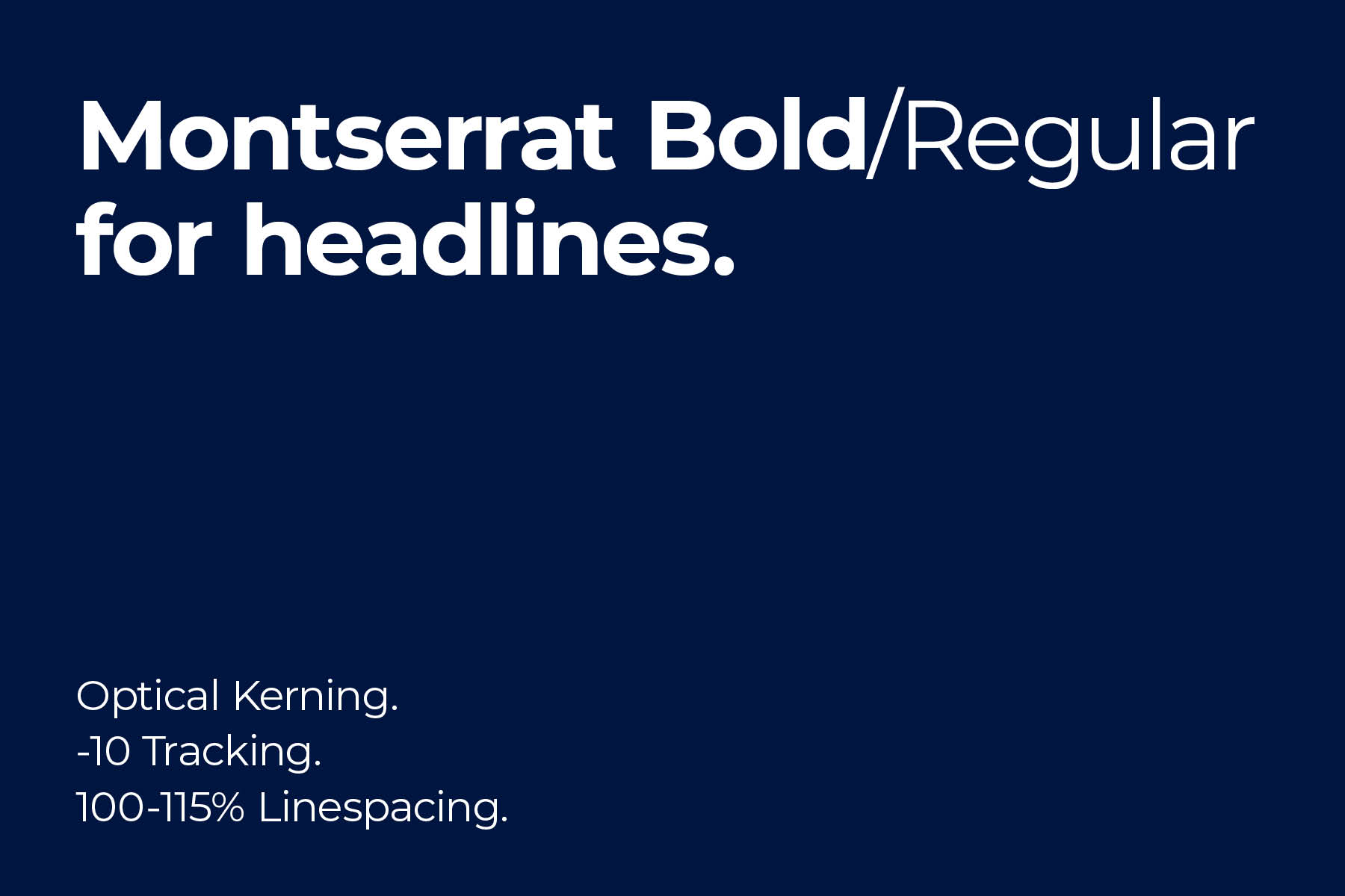 Montserrat is our primary typeface. This bold and contemporary sans-serif typeface comes in a variety of weights – four of which we recommend for use. Where possible, set paragraph text in sentence case.