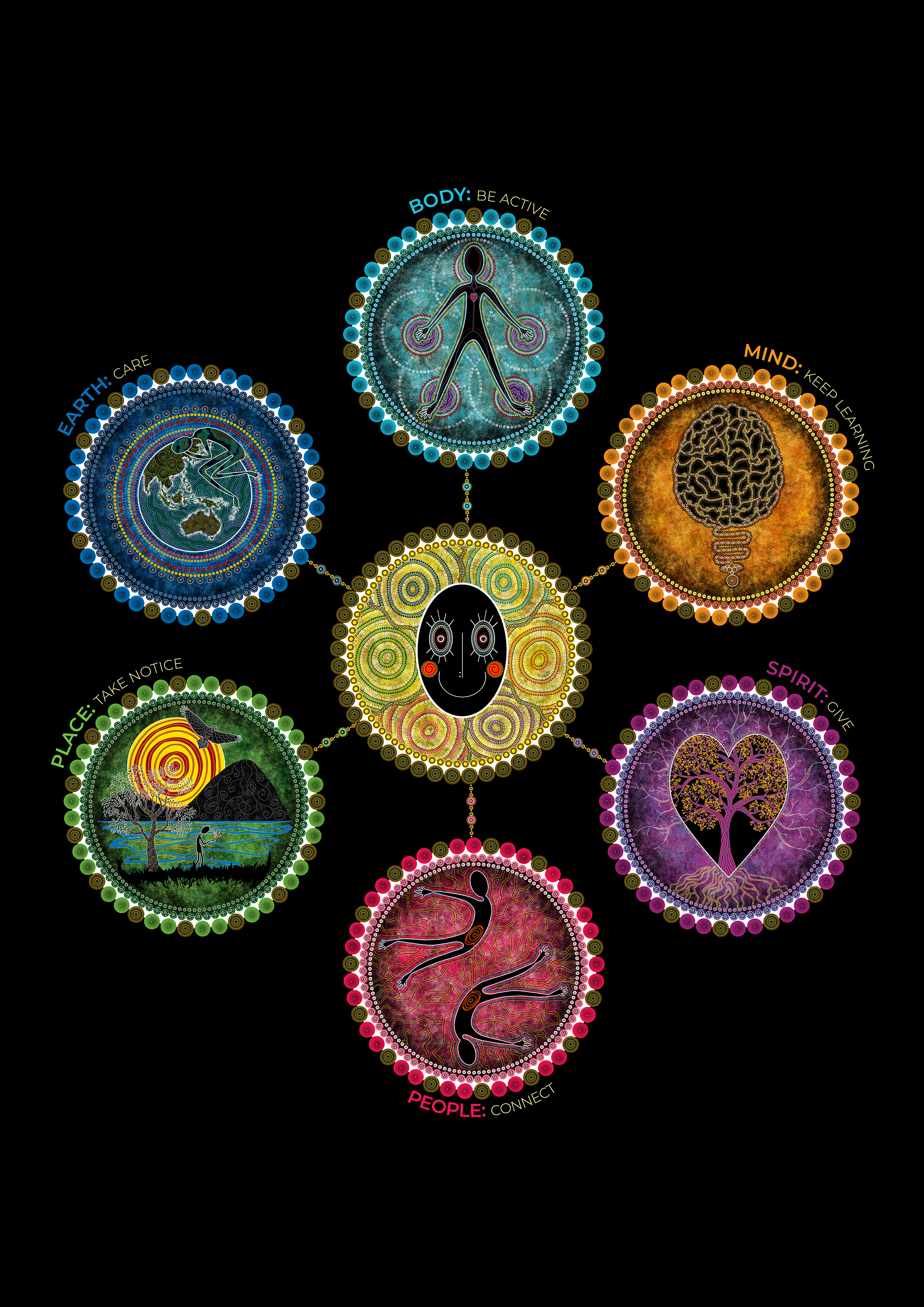 Woolyungah Indigenous Centre’s staff member Samantha Hill has artistically Indigenised the icons aligned to the Wheel of Well-being. Sammy is a proud Yuin woman and artist.