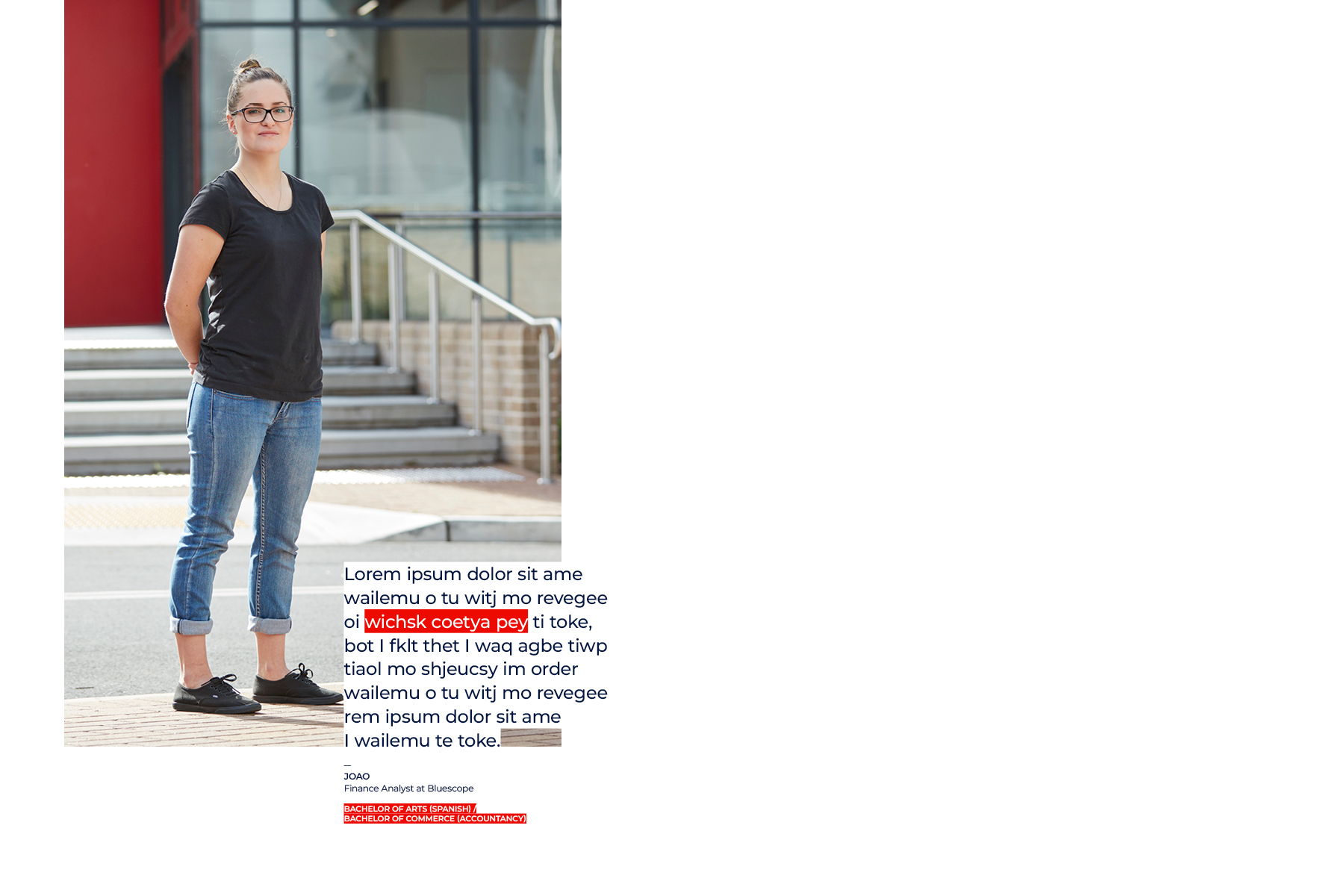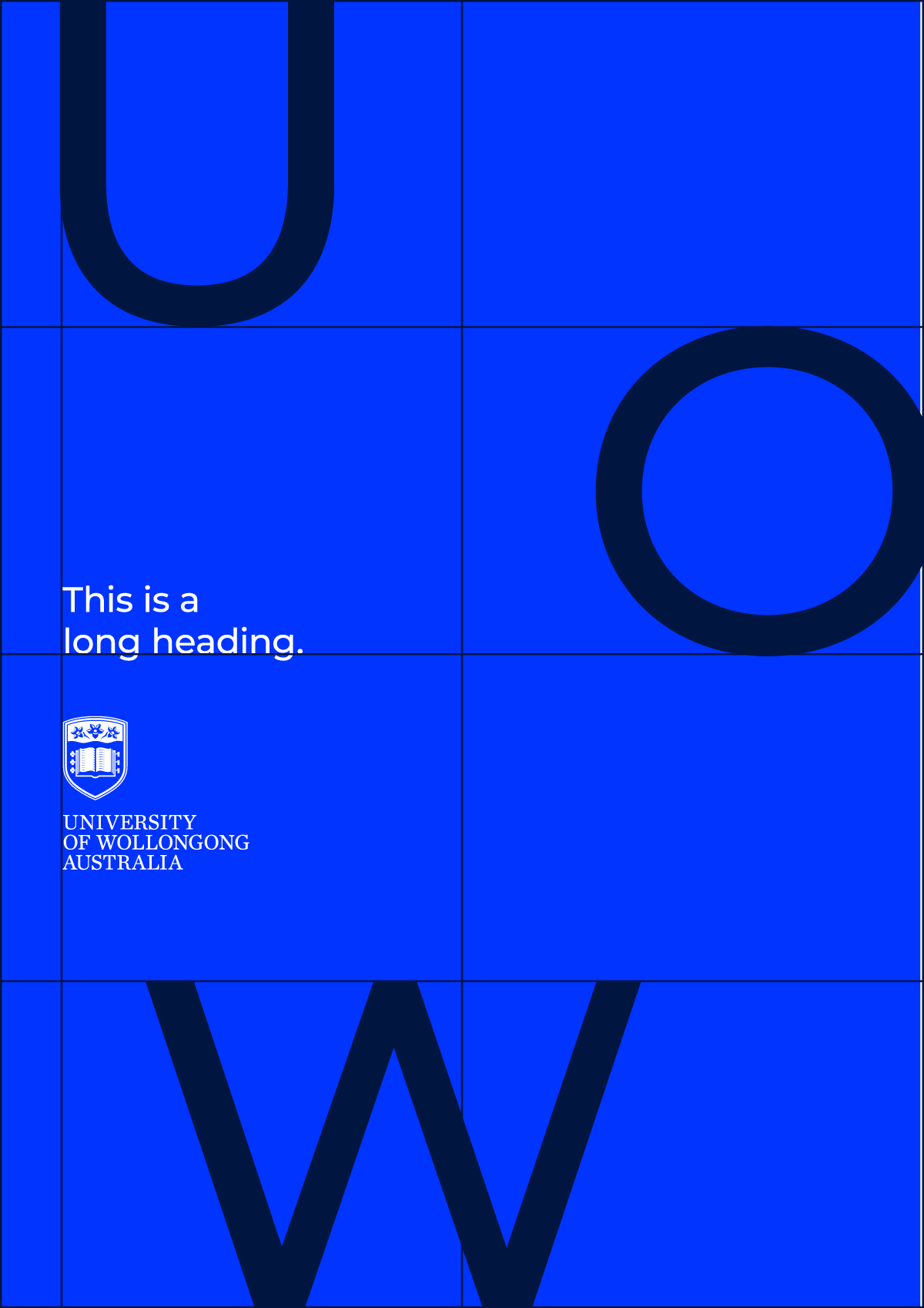 Highlighting keywords within headlines can be used in place of the UOW framework to create distinctive applications with an emphasis on type. When used with imagery, they help to provide clear space and legibility. As a general rule, when writing long headlines, emphasise approximately 20% of the overall headline. Shorter headlines can adopt a three colour combination.