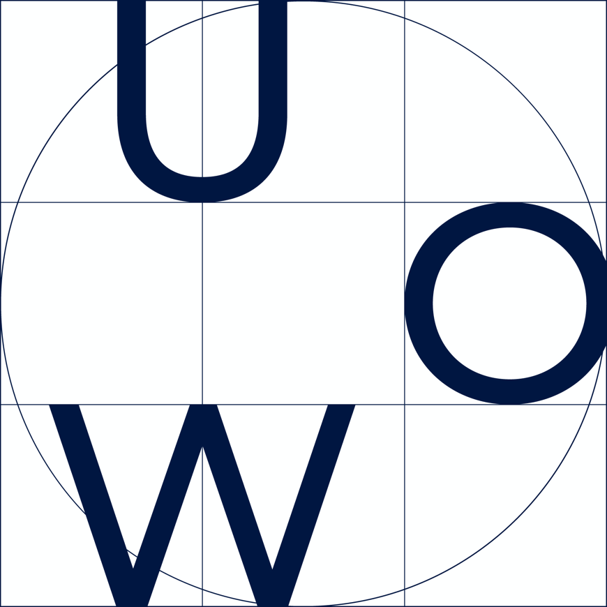 The UOW framework can be used to construct social icons using a simple 3x3 grid. Use the grid to position the letters, allowing for both circular and square crops. Social icons can be coloured freely using the primary colour palette for flexibility.