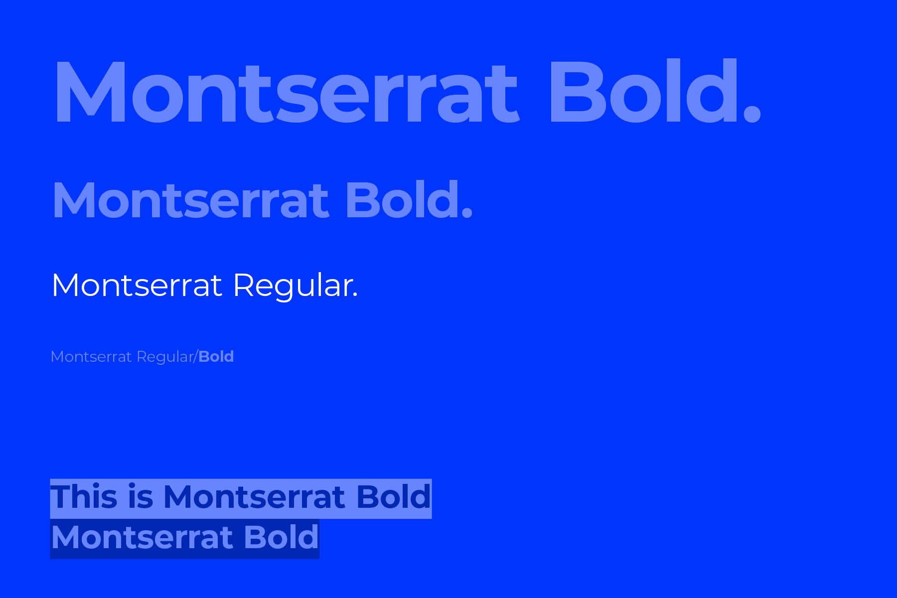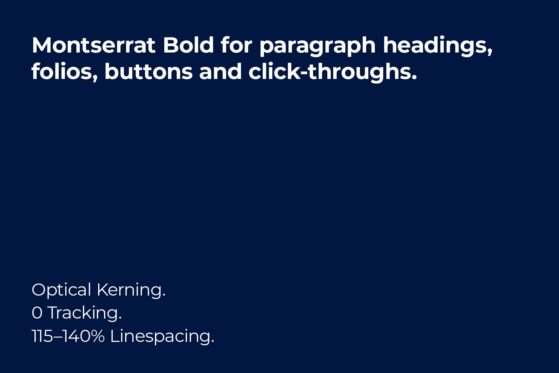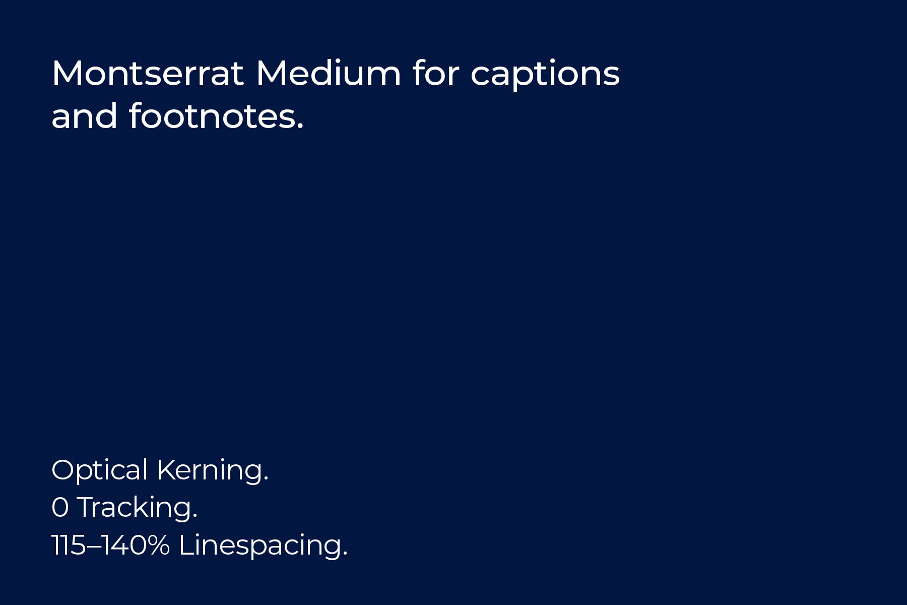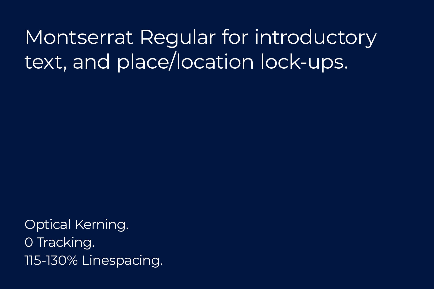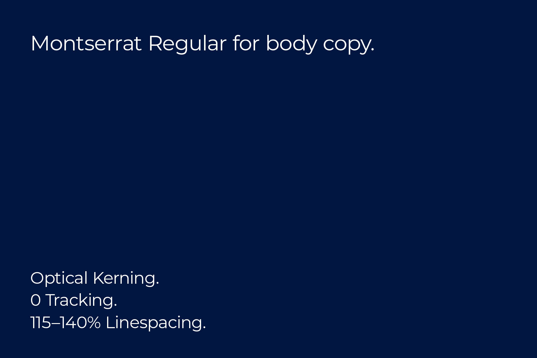 Montserrat is our primary typeface. This bold and contemporary sans-serif typeface comes in a variety of weights – four of which we recommend for use. Where possible, set paragraph text in sentence case.