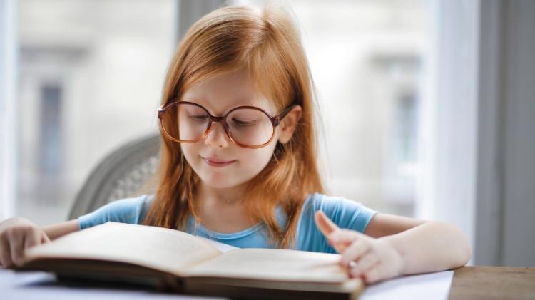 Girl with long ginger hair reading a book, wearing glasses