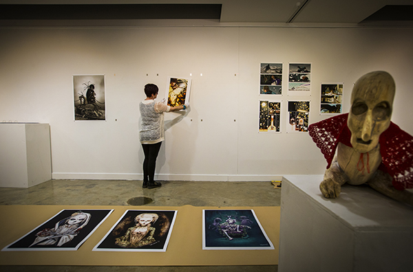 Dr Agnieszka Golda hangs art work in the TAEM gallery