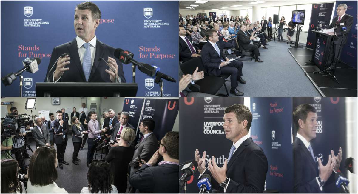 NSW Premier and Minister for Western Sydney the Hon. Mike Baird MP and Mr Craig Kelly MP, representing Federal Minister for Education and Training Senator the Hon. Simon Birmingham, joined Liverpool Mayor Cr Ned Mannoun and University of Wollongong (UOW) Vice-Chancellor Professor Paul Wellings, CBE in Liverpool today to announce the establishment of the University’s South Western Sydney Campus.
