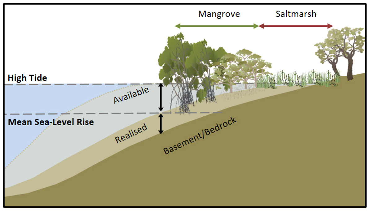 Sea-level rise leads to increased carbon sequestration due to what the researchers call “accommodation space” – the area available for a wetland to store mineral and organic sediments. In coastal wetlands, the boundaries of the accommodation space align with the upper half of the intertidal zone, roughly between the mean sea level and the high-tide level. As the sea level rises, so does the mean sea level and the high-tide mark, increasing the accommodation space in which carbon can be stored.