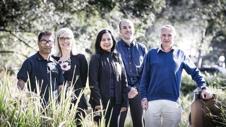 Blue Carbon Horizons team members Dr Debashish Mazumder (ANSTO), Associate Professor Kerrylee Rogers (UOW), Ms Atun Zawadzki (ANSTO), Dr Jeffrey Kelleway (UOW), and Professor Colin Woodroffe (UOW). Photo: Paul Jones, UOW