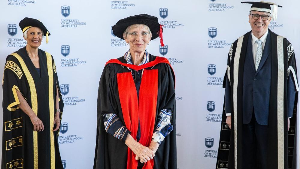 UOW Chancellor Elizabeth Magassy, Emeritus Professor Amanda Lawson, and Vice-Chancellor Professor Paul Wellings. Photo: Paul Jones