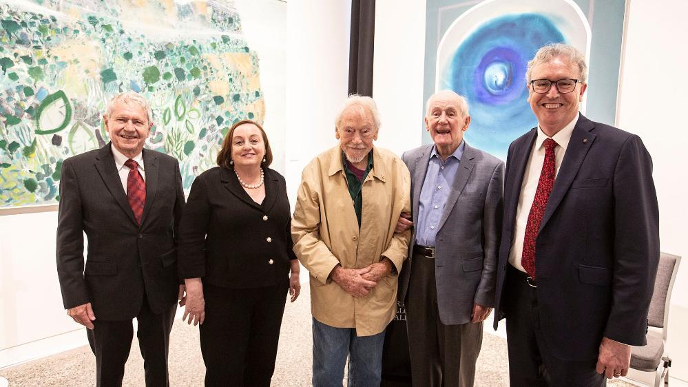 UOW Vice-Chancellors past, present and future with artist Guy Warren: (L to R) Emeritus Professor Gerard Sutton AO, Professor Patricia Davidson, Guy Warren, Emeritus Professor Ken McKinnon AO and Professor Paul Wellings CBE.