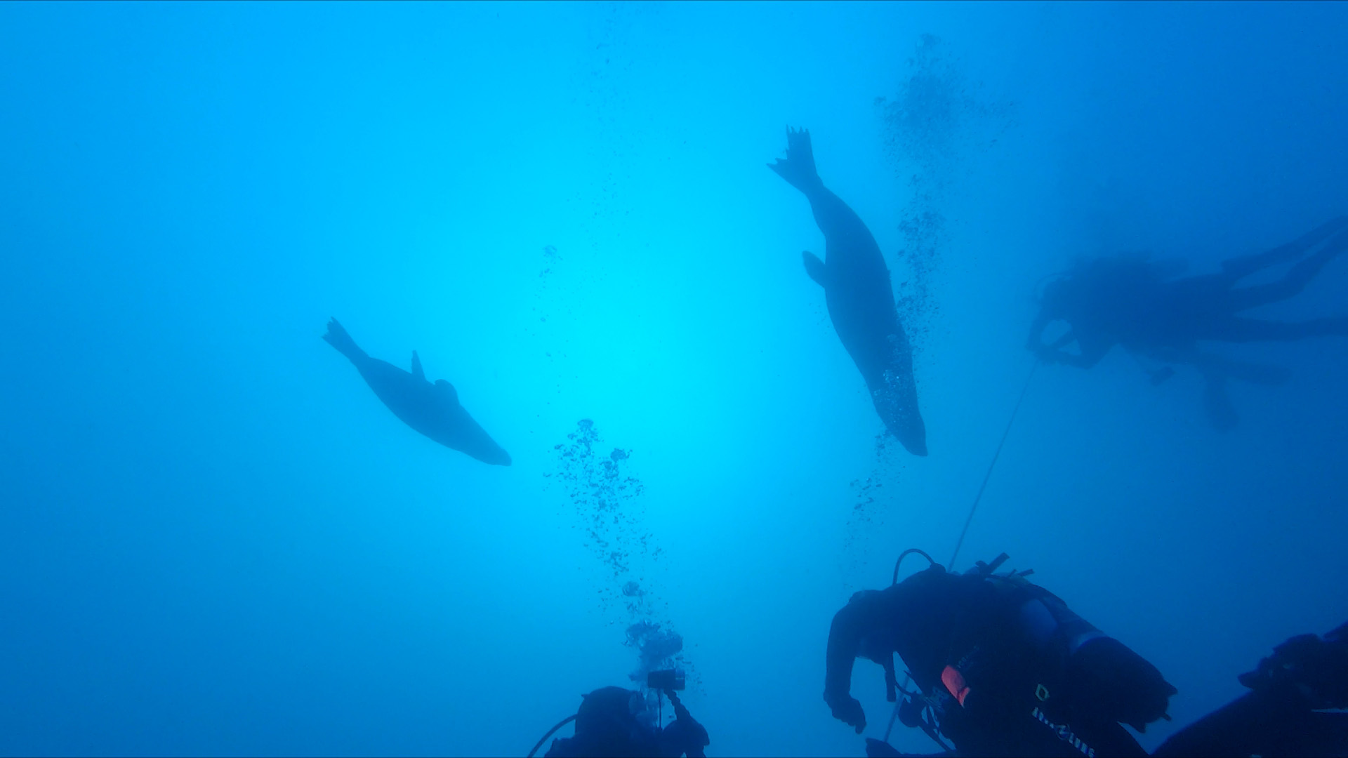Divers and seals off Big Island (aka "Rabbit Island") in the Five Islands Nature Reserve. Main picture: Surfers with a large school of salmon off the Illawarra coast.