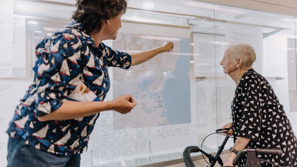 “Myangah Pirate is a fantastic Yuin artist, who I've known for a long time through the South Coast arts world,” Dr Saunders said. “His work in this exhibition is telling some of his and his community's stories of 'right here' - Yuin Country / the South Coast - using burnt-work and mapping, while mine is telling stories that emanate from the archives but which also draw on Yuin Country as represented by contour lines and waterways. We are both using maps of Country and narratives to tell stories from right here.”