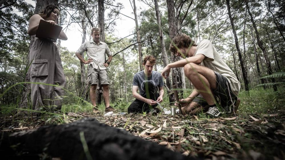 Main photo: The research team behind the cultural burning project, from left, Jessica Davis, Leanne Brook, Anthony Dosseto, Victor Channel, Kat Haynes, Brandon Clarke, Stuart Petty, Nicholas Deutscher and Tahli O'Connor.