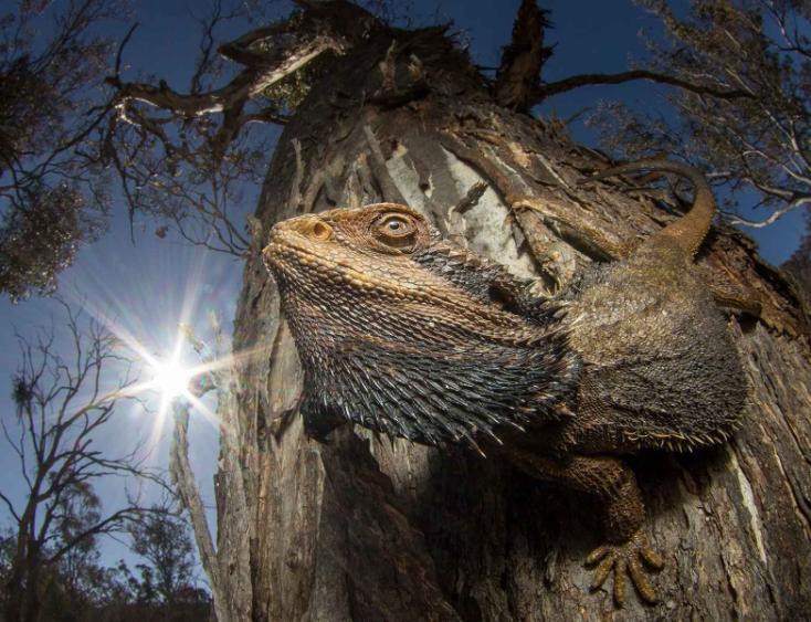“The relatively common species, the bearded dragon (Pogona barbata), was there, so nothing exotic or out of the ordinary. I remember just seeing it perched on a tree and wanted to take a wide-angle photo to include a bit more of the environment and the sun.