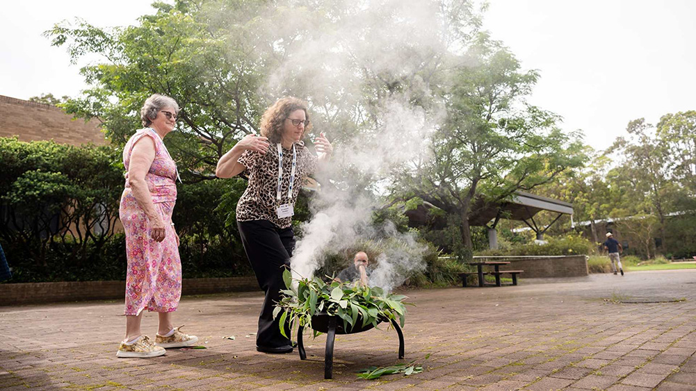 The conference opened with a heartfelt Welcome to Country and Smoking Ceremony led by local Elders Aunty Barb Nicholson and Uncle Peter Button, who shared the cultural and spiritual significance of these ceremonies. The outdoor setting for the ceremony was intentional and significant, connecting delegates to Country and allowing them to experience the ceremony as it was meant to be—in harmony with the land that has long been cared for by First Nations peoples. For many delegates—local, national, and international—this was an opportunity to confront Australia’s distressing past, recognise the ongoing impacts of colonisation, and reflect on our individual and collective responsibility to reduce inequalities. Brendan this sentiment, reminding participants that “Reconciliation, like change, starts with the small things. It starts with personal commitment and relationships.” This reflection and demonstration of respect continued throughout the conference, with presenters and facilitators encouraged to share their own connections to Country, building on the work of the Indigenous Strategy Unit in the conscientisation of the University and its business.