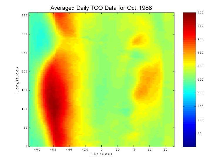 Figure 1. The spatial distribution of averaged daily total column ozone (TCO) data in Dobson Units (DU) for the month of October, 1988. The monthly averaged TCO data came from the British Atmospheric Data Centre (BADC).