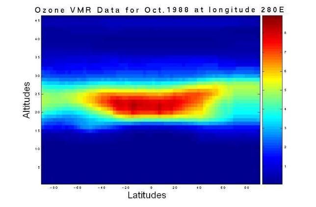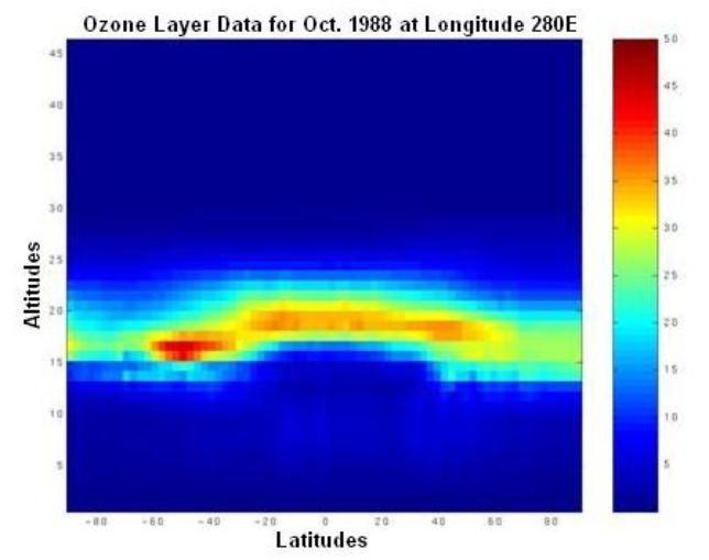 In large part, the earth's ozone distribution is controlled by the properties of the solar-earth system. First, the earth's gravity forces the air to stay around the surface of the earth and form the atmosphere. Second, the sun's energy, directly or indirectly, hits and heats the atmosphere and ground, then radiates away to outer space. Consequently, the atmosphere is stratified into several layers according to the variation in temperature. Meanwhile, UV energy from sunlight enables large-scale atmospheric chemical reactions, including the production and decomposition of ozone molecules. Due to the shape and rotation of the earth and the energy from the sun, there is variability in air pressure. Consequently, diverse air streams transport the products of the atmospheric chemical reactions globally from one place to another. Since the majority of atmospheric ozone is the result of photochemical reactions driven by the energy of the sun, the ozone distribution is dynamically and chemically determined by these processes. Figure 1 shows a plot of the two-dimensional distribution of the monthly mean total column ozone (TCO) in Dobson Units (DU) for the month of October 1988.