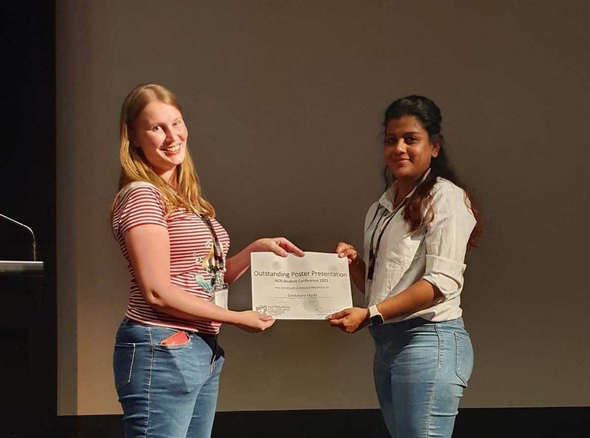 Awarded for her poster titled "Magnetoelectric Polymer Composites Functionality in Liquids”, Sulokshana received Outstanding Presentation honours alongside Xiaotian Wei from RMIT and Patrick Williams from UniSA.