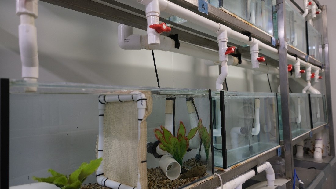 Each rack is equipped with a biofilter and a Pentair SMART UV steriliser. These aquaria have been used to study social interactions between native and invasive crayfish species, and the impacts of water temperature on competitive interactions between crayfish species.
