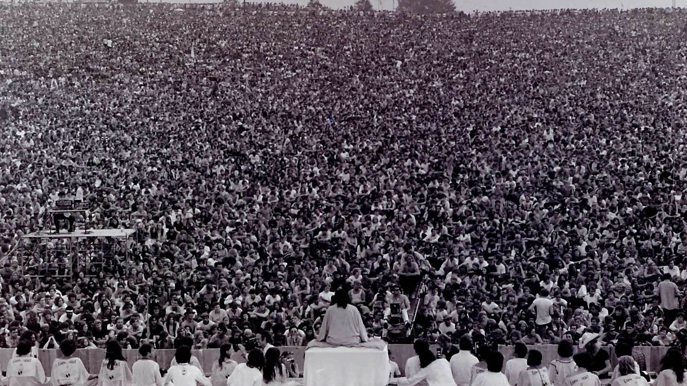 The opening of Woodstock 1969, with the Swami Satchidananda welcoming hundreds of thousands of people. Photo: Mark Goff/Wikipedia Commons