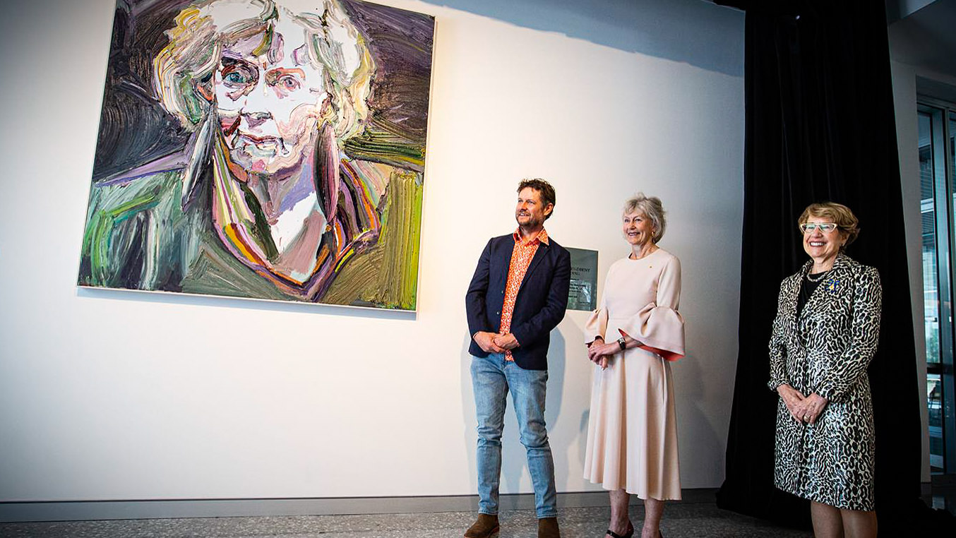 Chancellor Jillian Broadbent with her portrait at the opening of the Social Sciences and Arts Building. Photo: Paul Jones