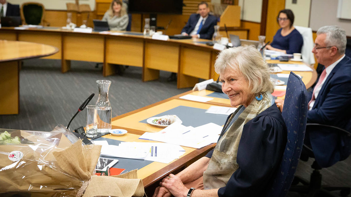 Chancellor Jillian Broadbent at her last meeting of the UOW Council in 2020. Photo: Paul Jones