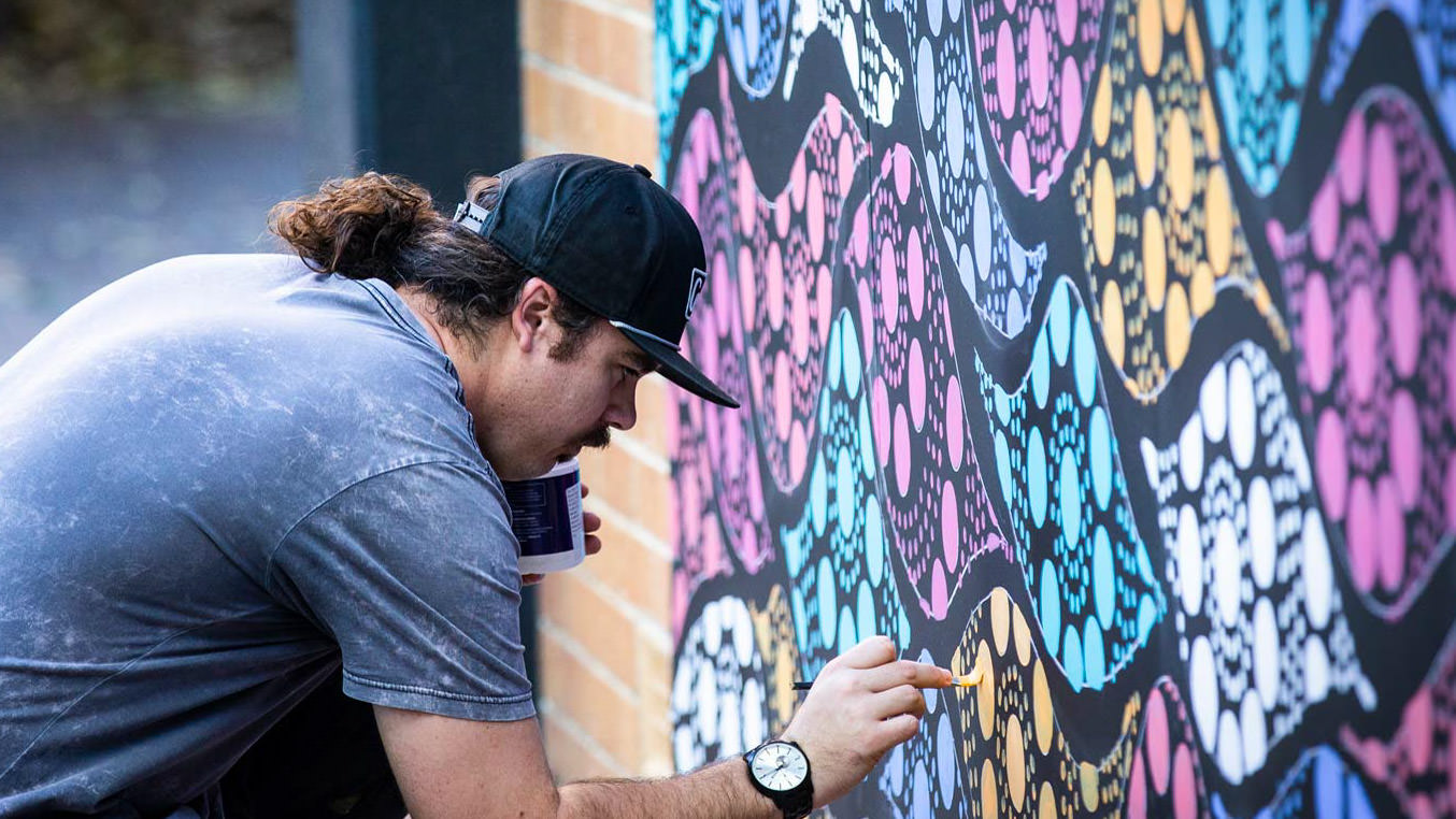 While he is no longer a teacher, and has pivoted from his degree into a career as a full-time artist, Zac says the skills he learnt at UOW have never left him. He retains a close link to the education sector; many of his murals are at primary schools throughout the region. One of the greatest benefits of his work as an artist has been the opportunity to open new audiences to the beauty and significance of Indigenous art.